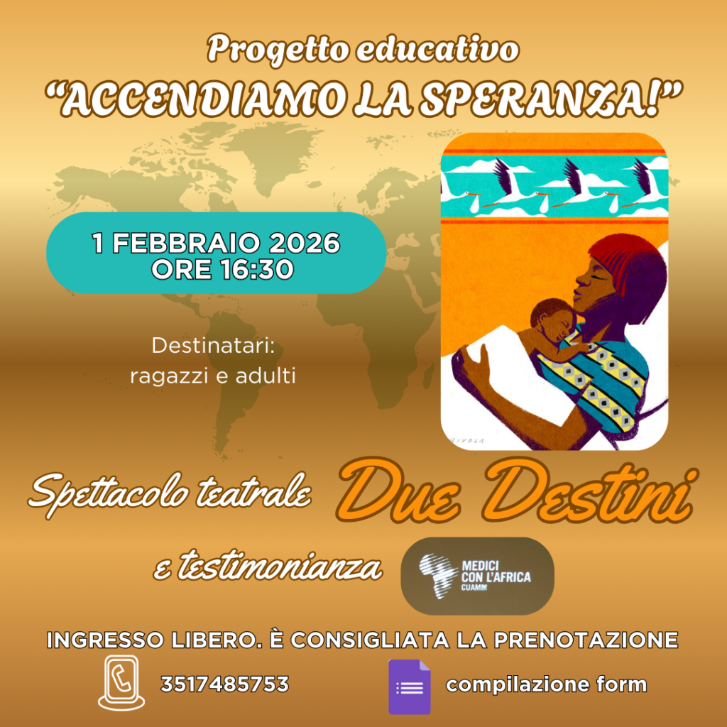 In collaborazione con la Commissione Famiglia della Comunità Pastorale di Cairate, viene proposto lo spettacolo teatrale “Due destini”, che racconta la vicenda di due bambini, concepiti uno in Europa e l’altro in Africa: un viaggio emozionante e commovente, che fa riaffiorare il vero senso della vita.