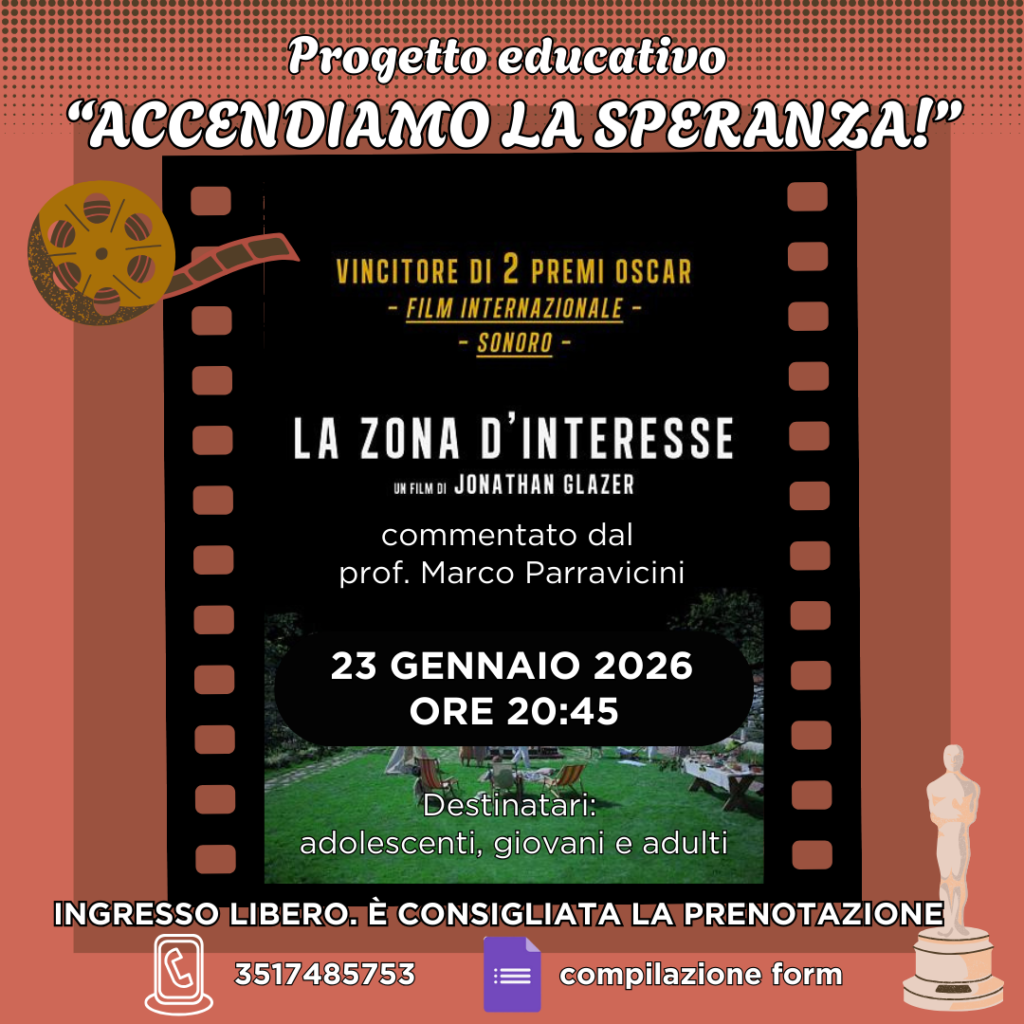In occasione del Giorno della Memoria, verrà proiettato il film “LA ZONA D'INTERESSE”, vincitore di due premi Oscar (Miglior film internazionale e Miglior sonoro). Il tema dell’Olocausto viene affrontato da una prospettiva nuova, con l’obiettivo di indurre lo spettatore a riflettere sul passato, ma soprattutto sul presente e sul futuro.